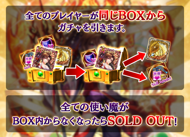- 【BOX内すべての中身が0】もしくは【BOX内の目玉使い魔の残数が0】になった場合、「SOLD OUT」となり、本シェアBOXガチャを引くことができなくなります。