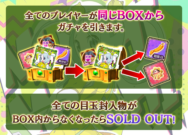 - 【BOX内すべての中身が0】もしくは【BOX内の目玉使い魔の残数が0】になった場合、「SOLD OUT」となり、本シェアBOXガチャを引くことができなくなります。