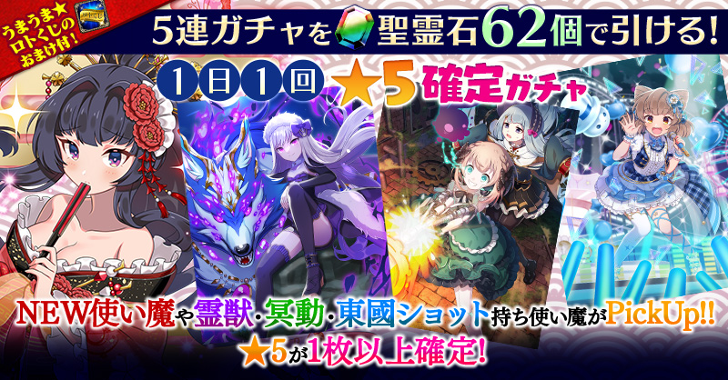 【一部NEW使い魔や霊獣・冥動・東國ショット持ち使い魔などがPickUP】1日1回★5確定ガチャ