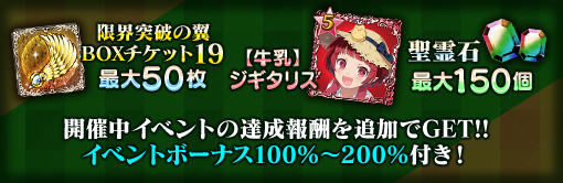 「イベントパス」を所持していると、開催中のイベントポイントに応じて「聖霊石」「限界突破の翼BOXチケット19」「使い魔」などの追加報酬を獲得できます。