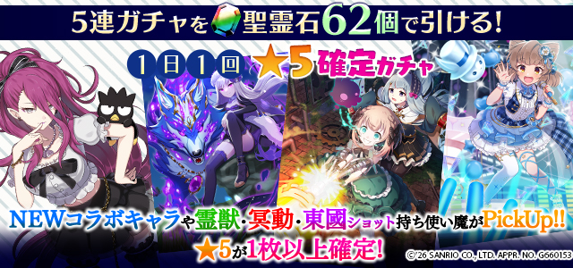 【一部NEWキャラクターや霊獣・冥動・東國ショット持ち使い魔などがPickUP】1日1回★5確定ガチャ