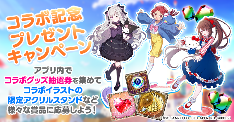 - 本引換券の対象アクリルスタンドはホーム画面のSPECIALボタンから遷移できるページ内のものと同一となりますが、サンリオキャラクターズ集合イラストのアクリルスタンドは対象外となります。