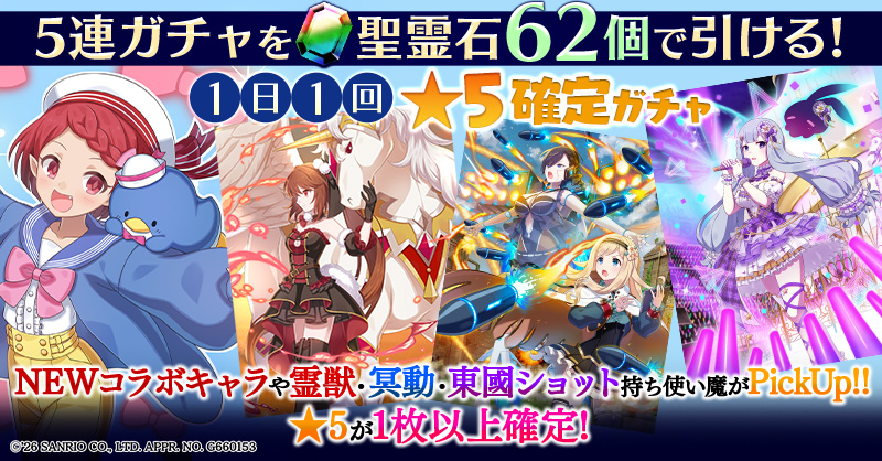 【一部NEWキャラクターや霊獣・冥動・東國ショット持ち使い魔などがPickUP】1日1回★5確定ガチャ