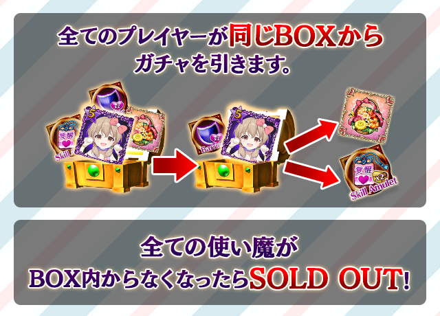 - 【BOX内すべての中身が0】もしくは【BOX内の目玉使い魔の残数が0】になった場合、「SOLD OUT」となり、本シェアBOXガチャを引くことができなくなります。