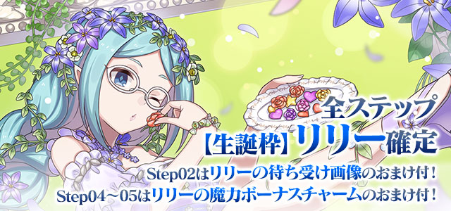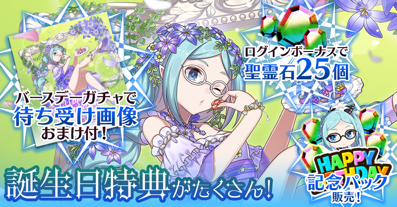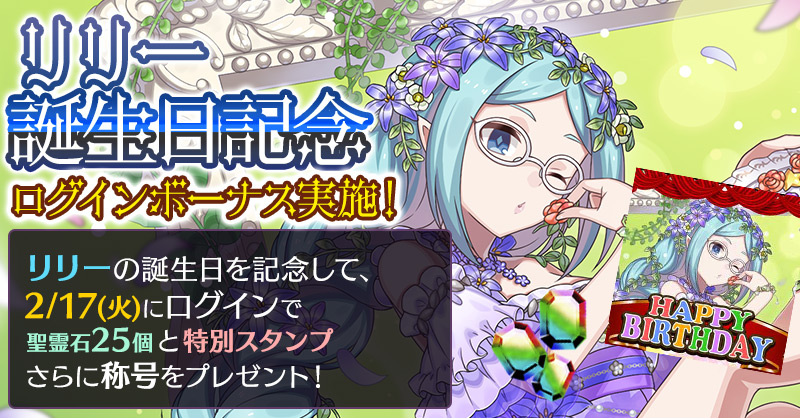 リリーの誕生日を記念して、誕生日当日にログインすると「聖霊石:25個」と、掲示板で使用できる特別スタンプや、称号をプレゼント!!