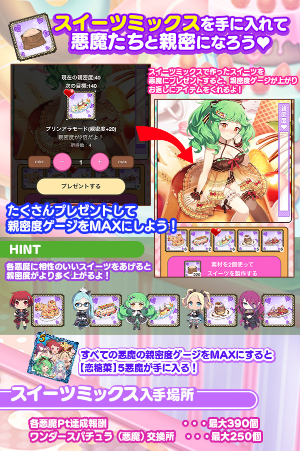 - スイーツミックスで作ったスイーツは2026/3/10(火)メンテナンス後から使い魔の親密度ギフト(親密度+10)として使用できるようになります。