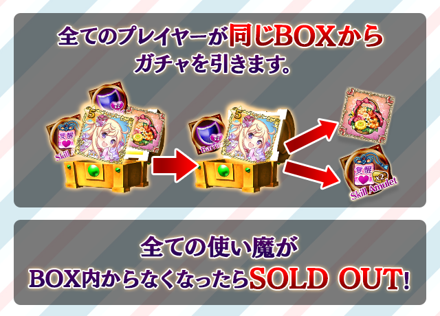 - 【BOX内すべての中身が0】もしくは【BOX内の目玉使い魔の残数が0】になった場合、「SOLD OUT」となり、本シェアBOXガチャを引くことができなくなります。