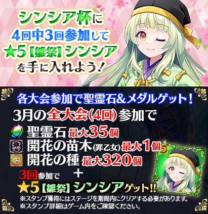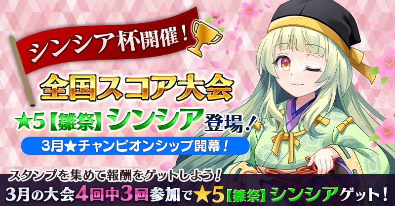 【毎週土曜!3回参加で★5【雛祭】シンシアGET】3月全国スコア大会!!