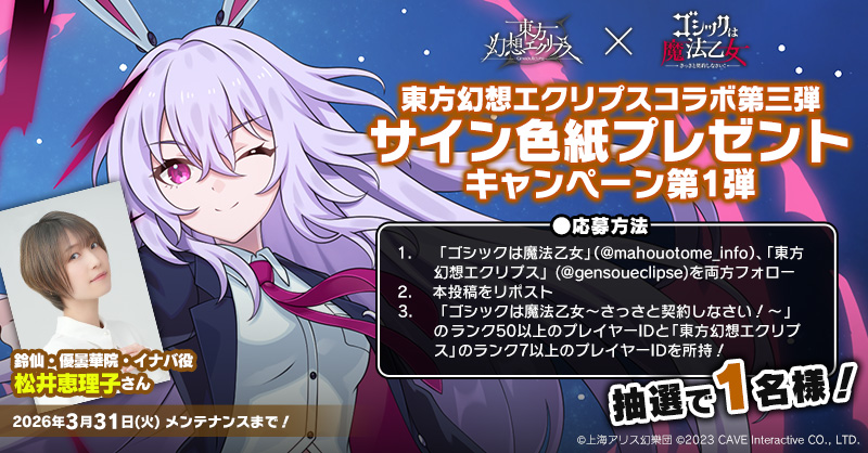 ※「ゴシックは魔法乙女~さっさと契約しなさい!~」のランク50以上のプレイヤーIDと「東方幻想エクリプス」のランク7以上のプレイヤーIDを両方所持している方が当選対象となりますのでご注意ください。