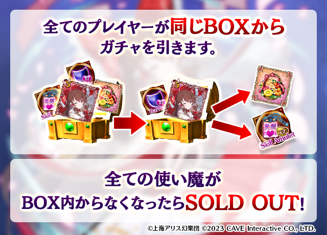 - 【BOX内すべての中身が0】もしくは【BOX内の目玉使い魔の残数が0】になった場合、「SOLD OUT」となり、本シェアBOXガチャを引くことができなくなります。