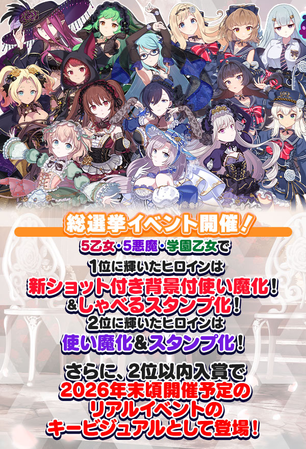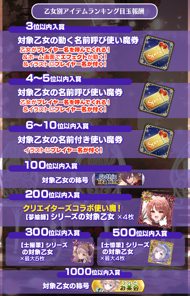 - 「本日の乙女ランキング」の報酬は各日の初回ログイン時、前日の結果に応じてプレゼントに配布されます。