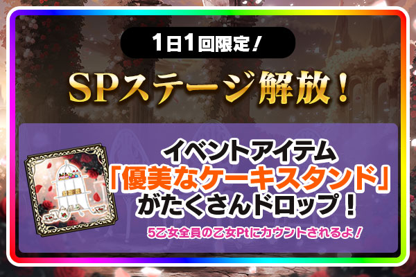 | 3話解放条件 | 優美なケーキスタンドを5000個獲得 | ||