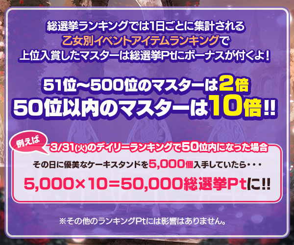 ※1日1回ステージのみ出撃するなどで一番多く乙女Ptを獲得している乙女が複数いる場合はいずれか1乙女のランキング報酬のみ獲得できます。