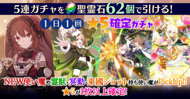 【一部NEW使い魔や霊獣・冥動・東國ショット持ち使い魔などがPickUP】1日1回★5確定ガチャ