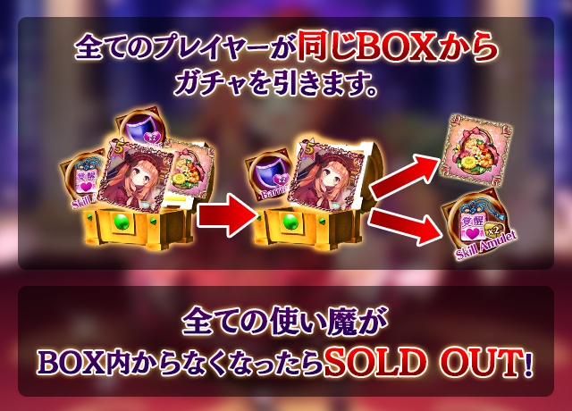 - 【BOX内すべての中身が0】もしくは【BOX内の目玉使い魔の残数が0】になった場合、「SOLD OUT」となり、本シェアBOXガチャを引くことができなくなります。