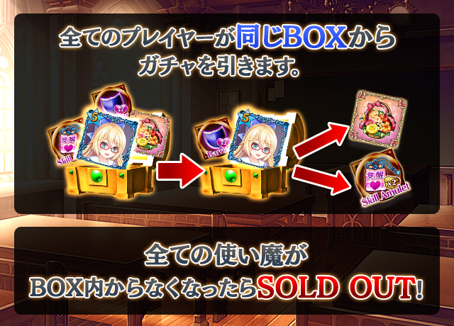 - 【BOX内すべての中身が0】もしくは【BOX内の目玉使い魔の残数が0】になった場合、「SOLD OUT」となり、本シェアBOXガチャを引くことができなくなります。