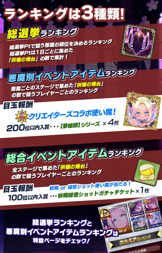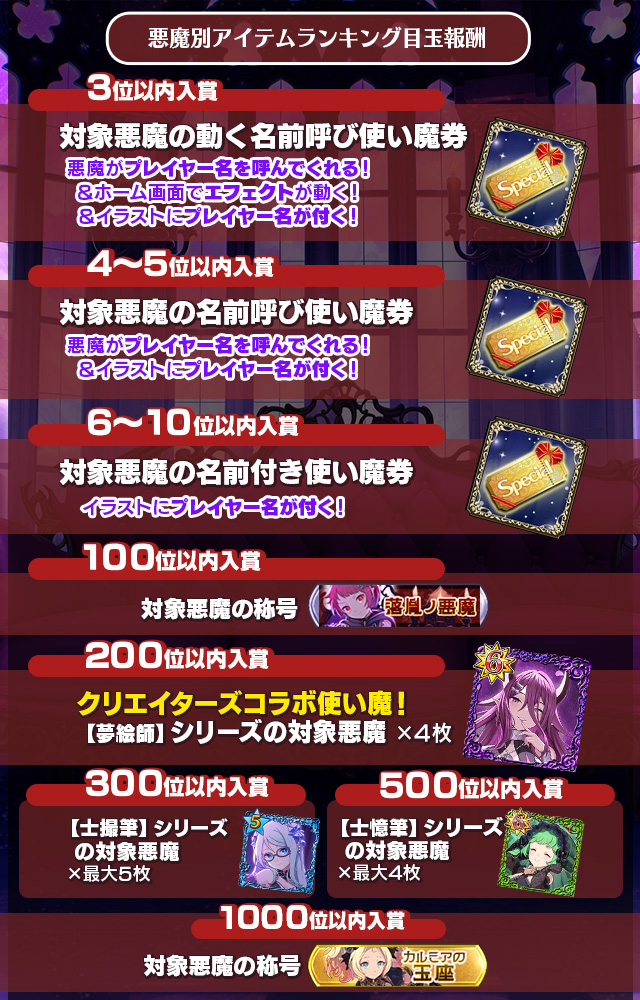 - 「本日の悪魔ランキング」の報酬は各日の初回ログイン時、前日の結果に応じてプレゼントに配布されます。