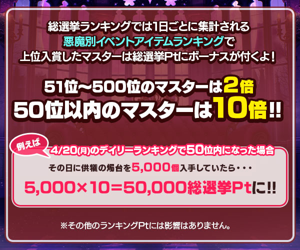 1日のうちに獲得した乙女Ptによるランキングの順位に応じて「復刻悪魔交換券」が獲得できます。