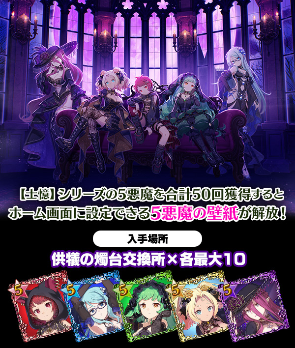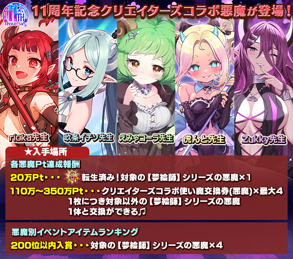 - さらに、各悪魔Pt達成報酬の「クリエイターズコラボ使い魔交換券(悪魔)A~E」は対象1悪魔以外の4悪魔から選んで交換できるよ!